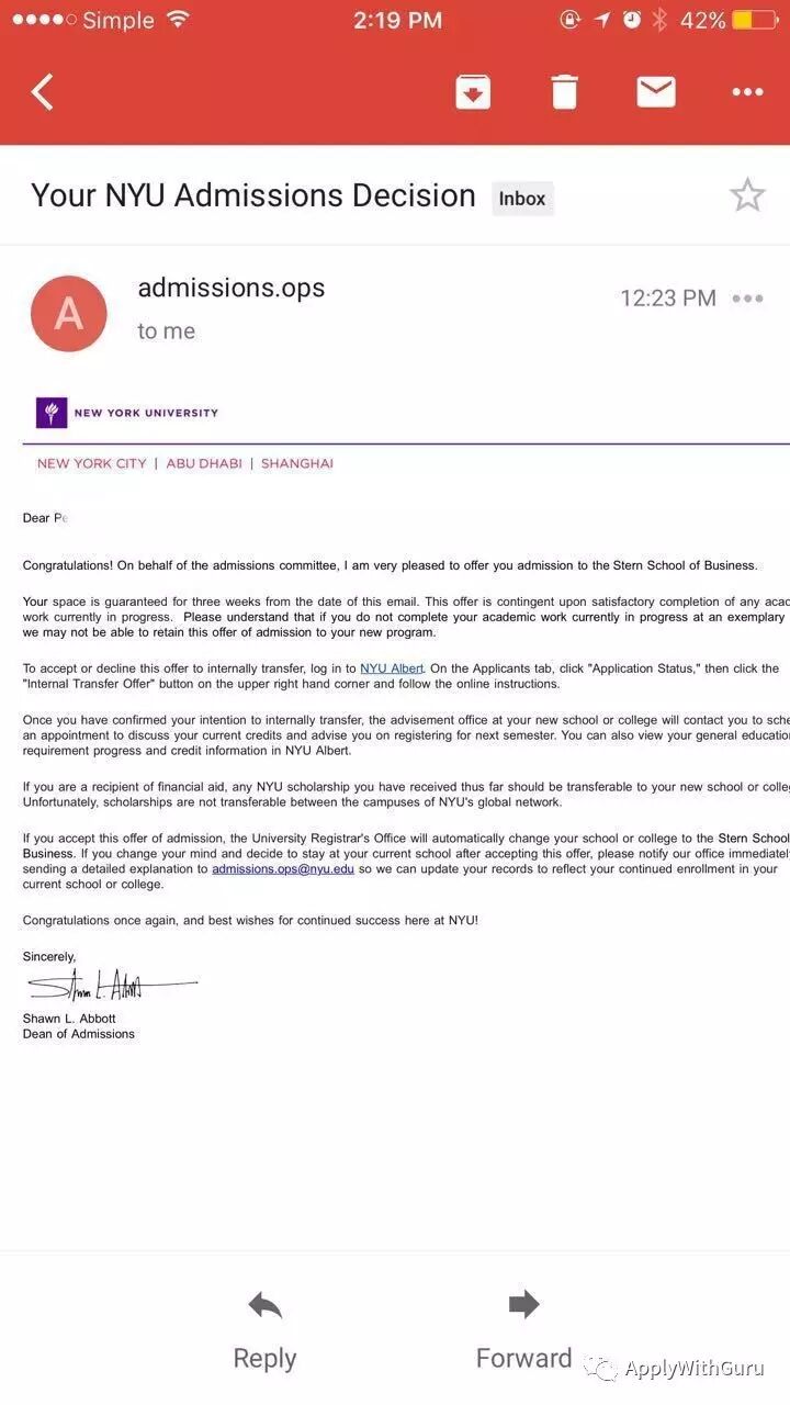 P同学是我以前的学生。2年前以2150分的成绩直接ED成功进入NYU 纽约大学CAS文理学院就读。她本人非常喜欢纽约大学,并且在纽约大学生活学习的过程中,耳濡目染金融行业对于所有学生的影响。继而想转学商学院。经过反复劝说,P同学不喜欢Wharton的地理位置,仍然极度钟情于纽约大学本身的Stern商学院。所以,随即帮她申请了转学。外界纷纷声称,纽约大学内部转学相对容易,但是问题在于Stern的名号全美皆知,为了能够日后在金融业有所发展,大部分NYU的学生都有这个想法,NYU之外的学生也为了能够扎进金融业,不断钻营。所以转学Stern的难度还是非常大的。尽管如此,P同学还是强势收获录取。