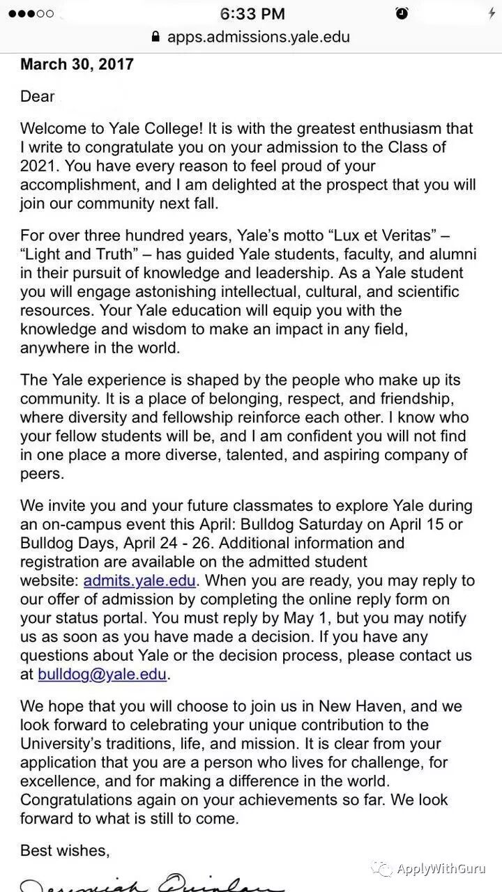 L同学就读于西海岸的美国寄宿高中,这所高中一向排名比较高,算作是西部寄宿高中里的翘楚。学校升学质量一向不错。L同学超级学霸,我们认识的比较早。在我的引导下,大量阅读,海量学习。ACT首考35,SAT首考1580,AP 8门5分,SAT II4门800. 难能可贵的是,L同学不仅学习出众,还是学校多个社团的主力和领袖。这样的学生机会就是所谓的完美申请人。所以他在2月上旬是事实上已经收到Yale的likely letter,即预录取信。所以,昨天的offer基本上只是一个延时的祝贺。