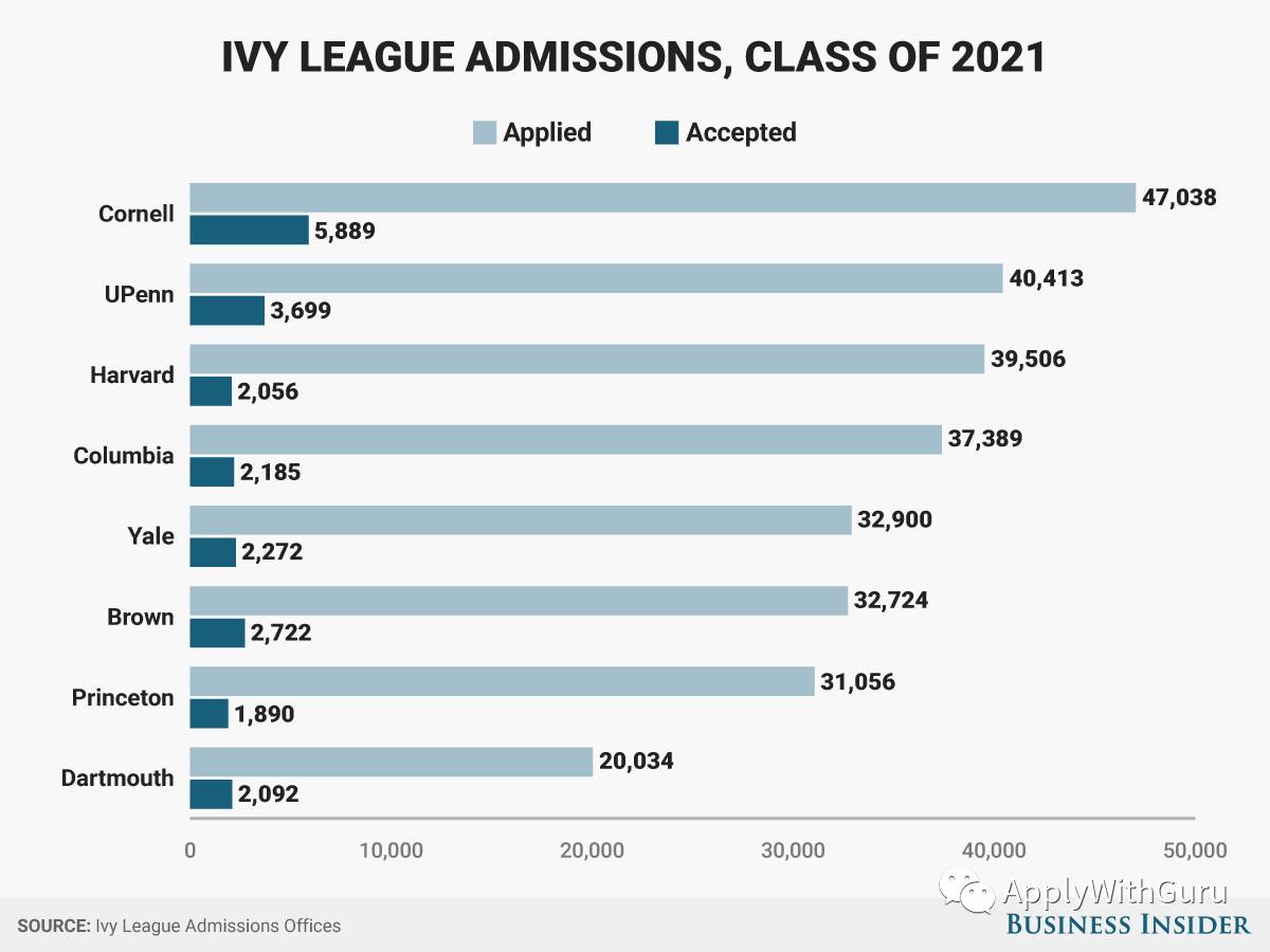 废话不说,直接上图。这是Business Insider统计出来的常春藤八所学校的总共申请人数以及录取人数。需要注意的是,所有录取人数里几乎一半都是来自于EA/ED提前申请,这也是常春藤学校的惯例,通过提前申请几乎锁定一半学生。所以,留给RD常规申请的名额并不多。