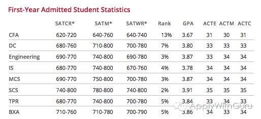 上图中SAT部分都带有*号,表示就读的学生中中间50%的学生的成绩分布。那就意味着这个分数区间是里面大多数孩子的成绩水平。ACTC代表了学生的ACT综合成绩。