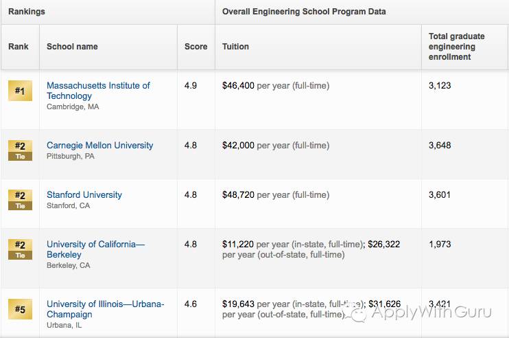 上图为计算机工程领域研究生排名,计算机领域的本科排名差别也不是很大。从中可以看出,MIT与Stanford难度过为巨大,很多学生和家长都将其视为酱油选择。而UIUC由于综合排名较低以及地理位置,被部分挑剔的学生视为备选方案,所以综合而分析UC Berkeley 与CMU就成为唯一合适的选择了。考虑到UC系列的学校单独使用申请系统,也没有ED,EA提前申请政策,那么CMU卡耐基梅隆成为非常得体的一所学校。
