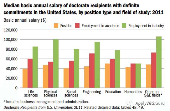 上图显示了不同学科领域,不同行业内博士毕业生的薪资水平。绿色线条代表了非学术圈即工业实业界的中位收入水平,可以看出这个最高的线条明显代表了如果博士不从事学术圈里的工作,那么收入会提高一大截。自然科学,工程以及其他一些交叉学科,年薪中位值都可以达到10万美金,紧随其后的是生命科学,社会科学以及教育学相关领域,而最低的人文学科收入最低。红色代表了学术圈,基本意味着大学里的助理教授AssistantProfessor职位或者研究机构的初级研究员,可以看出明显比工业界低了一截。而最低的黄色线条代表了博士毕业后最为艰辛的博士后研究员阶段,收入最低。