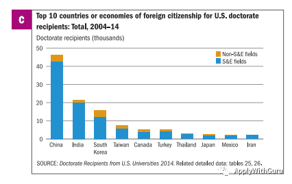 - 移民:爱国小将对于这个话题自然不感冒。但是对于其他人来说,博士学位是一个便捷的移民通道。相比于工作机会的微乎其微,以及H1B抽签的不确定性,拥有博士学位的人可以更加自由方便的选择其他移民方式,比如EB1或者NIW,这些都是美国政府为了招揽高质量国际人才所作出的举措。上图即为2004至2014十年间美国博士学位授予人的国籍。可以看到大约将近45,000名中国人在此10年间获取博士学位,绝大多数为科学与工程学科博士。这些人当中的大多数都基本通过各种方式完成了身份的转移。