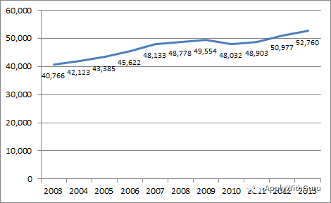 如上图所示,这是全美大学最近一些年来,每年所有研究型大学共同授予的博士学位数量。曲线呈现缓慢增长,但是基本保持较低的斜率。进入2012年以来,美国大学大约每年培养5万余名博士,涵盖各个学科和领域。2014年全美各个高校共授予了54,070名博士学位。