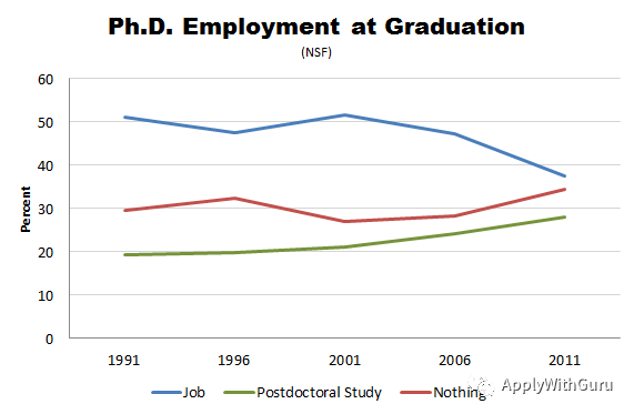 上图是美国国家科学基金会NSF统计的博士毕业时的去向,蓝色线条表示,近些年来大约有40%的博士毕业生会找到工作,将近30%的毕业生会选择从事博士后研究。有超过30%的博士毕业生毕业时仍然不知道自己人生下一阶段去哪里以及要干什么……