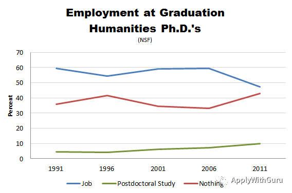 上图显示了最为悲惨的人文学科类博士毕业生的状况,以2011年为例,大约只有略低于一半的毕业生顺利找到工作,而红色线条代表的超过40%的毕业生不知道人生下一阶段要去哪里,要做什么……